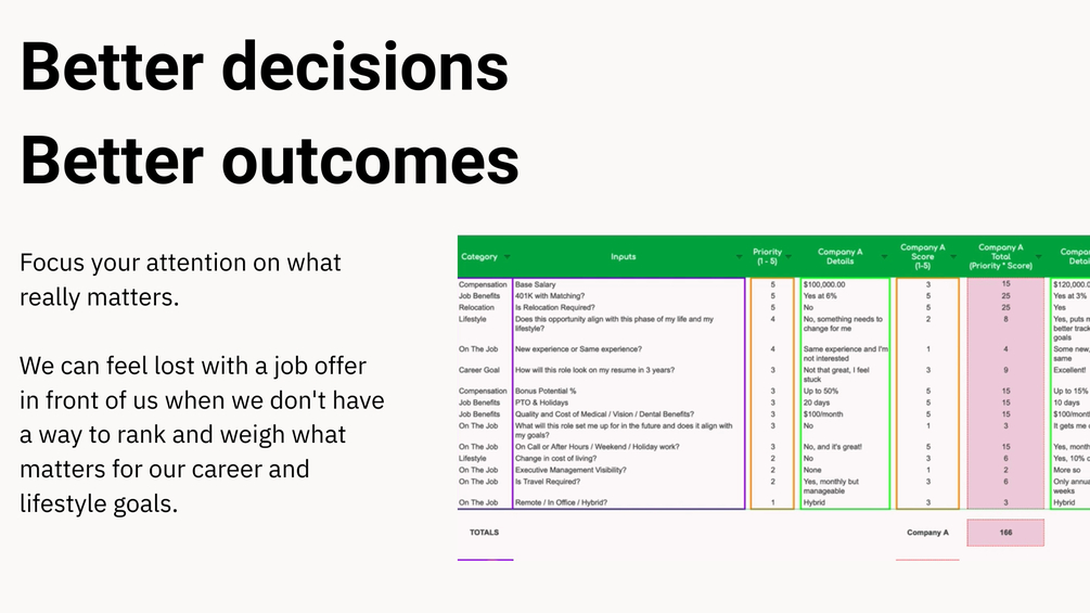 I needed a way to understand and focus on what was important to me outside of compensation. This is when I made this calculator and used decision science principles to help me find the right path.